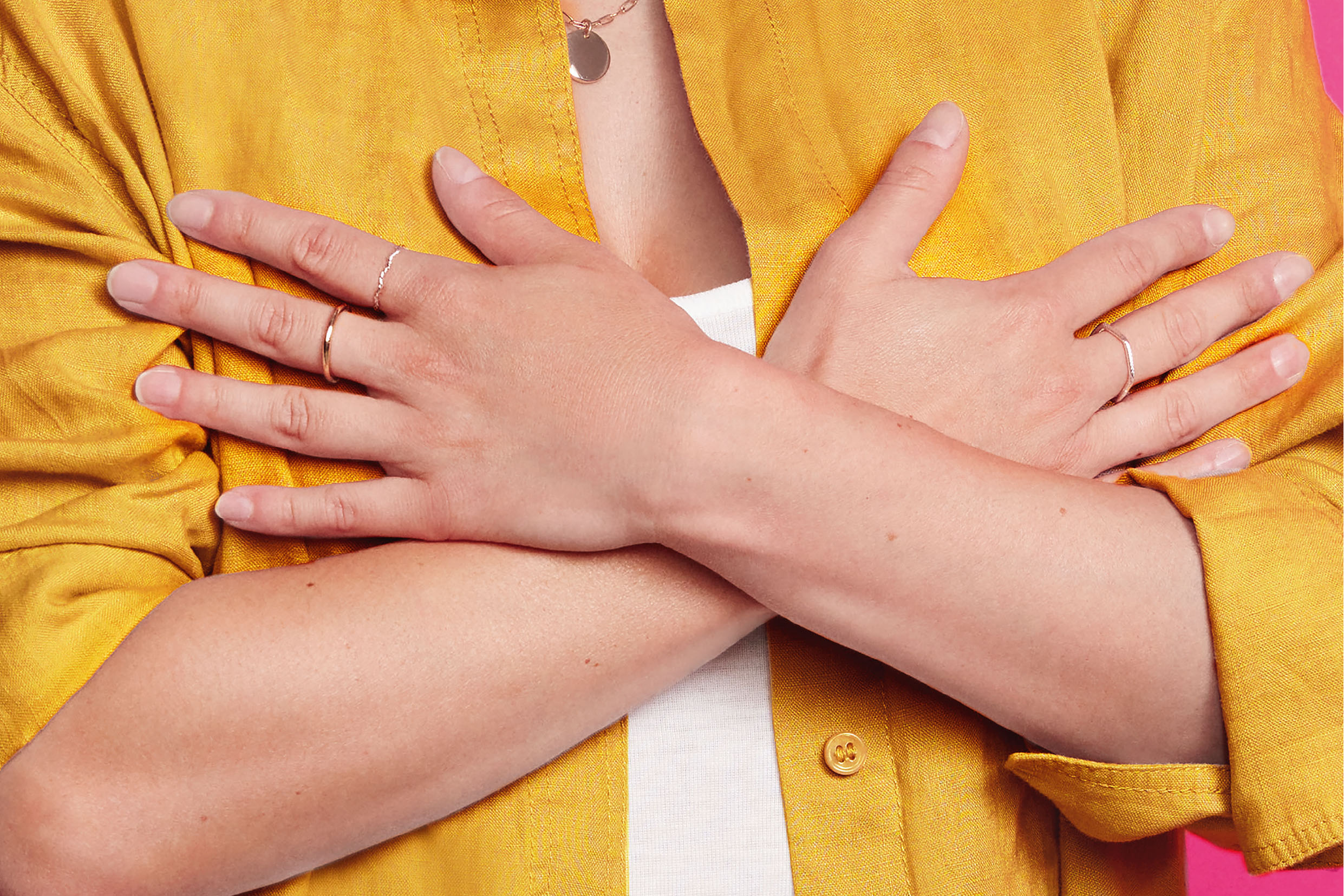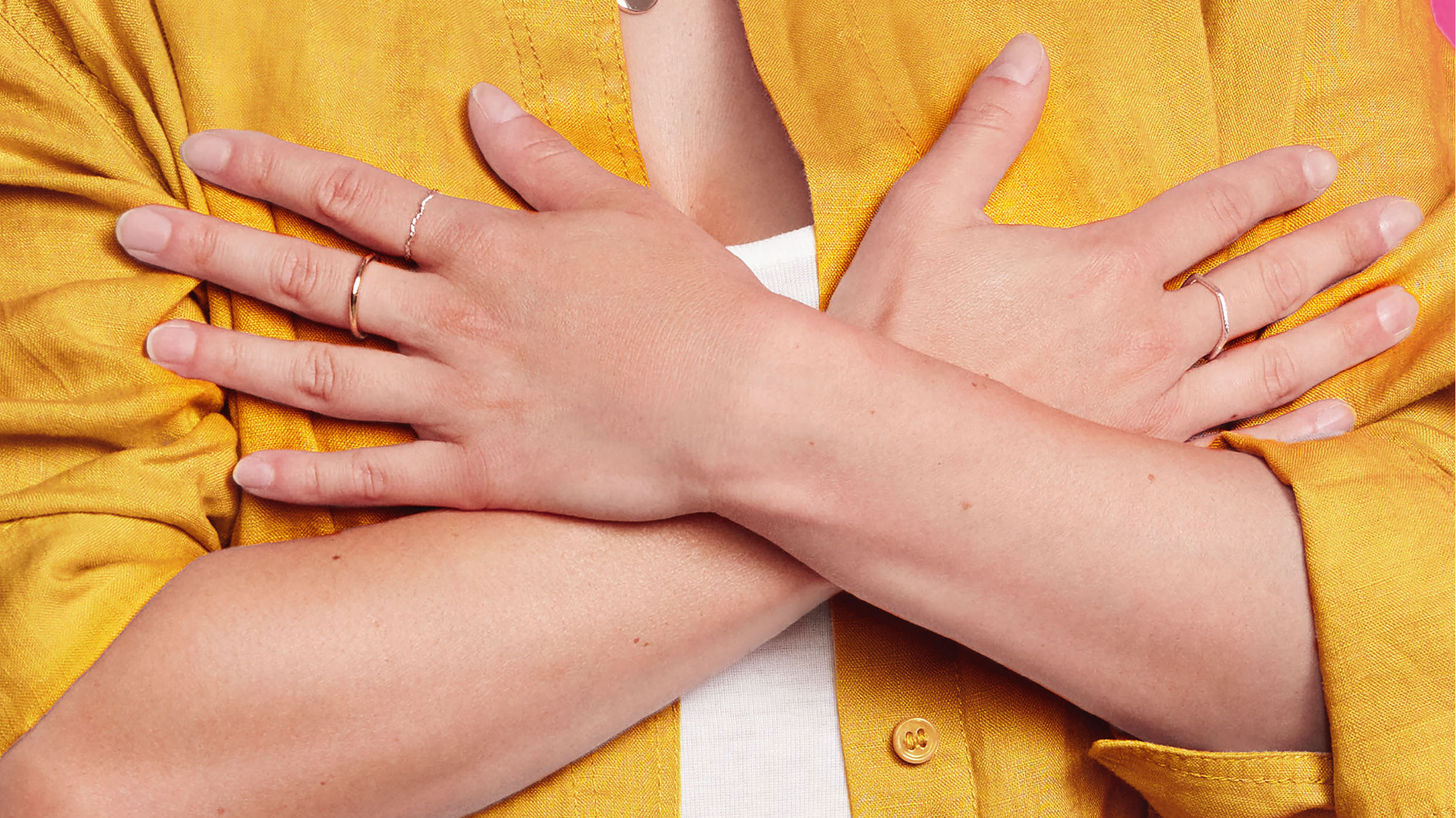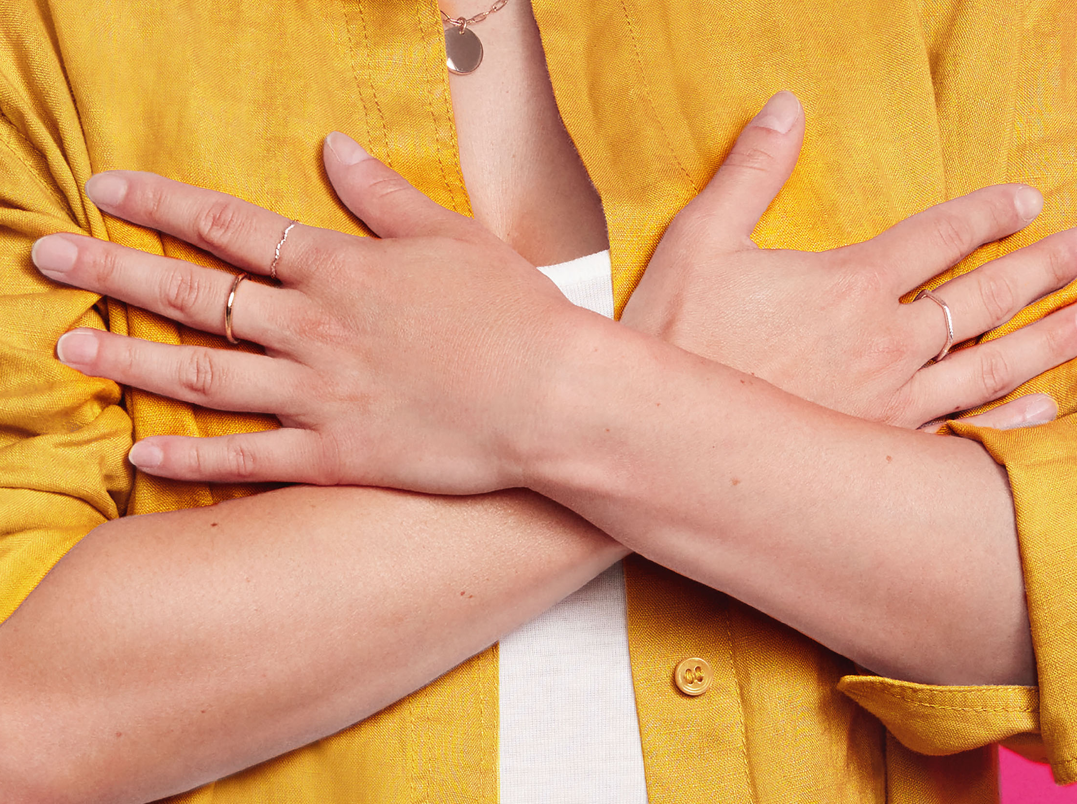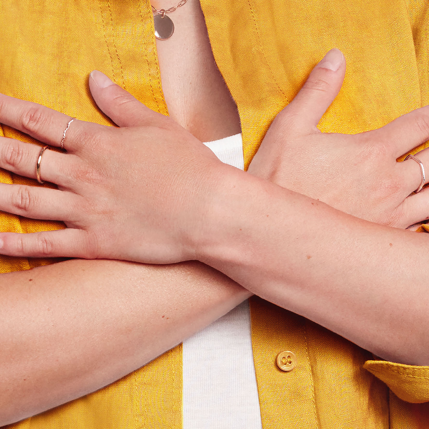 Gros plan sur une personne croisant les bras sur sa poitrine, vêtue d'une chemise jaune, illustrant un geste symbolique ou de soutien pour une campagne de sensibilisation.