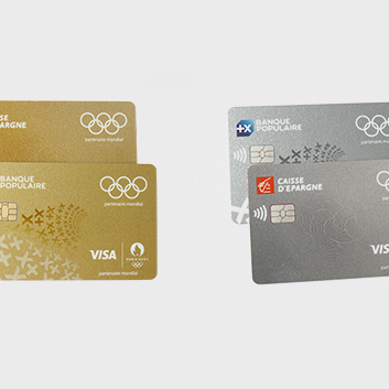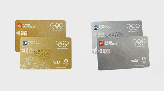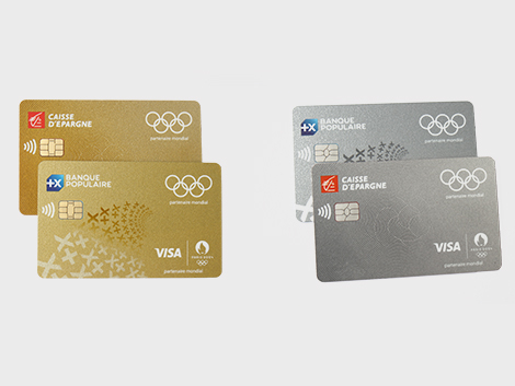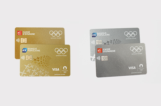 Visuels des cartes bancaires Visa édition spéciale Jeux Olympiques Paris 2024, proposées par Banque Populaire et Caisse d'Epargne, en version or et argent, avec logos institutionnels et anneaux olympiques.
