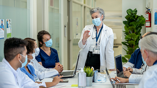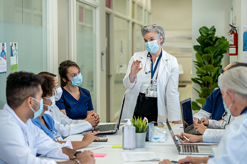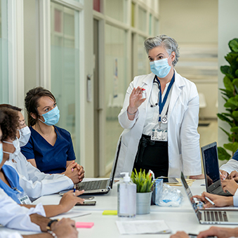 Réunion d’une équipe médicale en blouse blanche et masques de protection, travaillant sur ordinateurs portables et documents, dans un couloir d’établissement de santé.