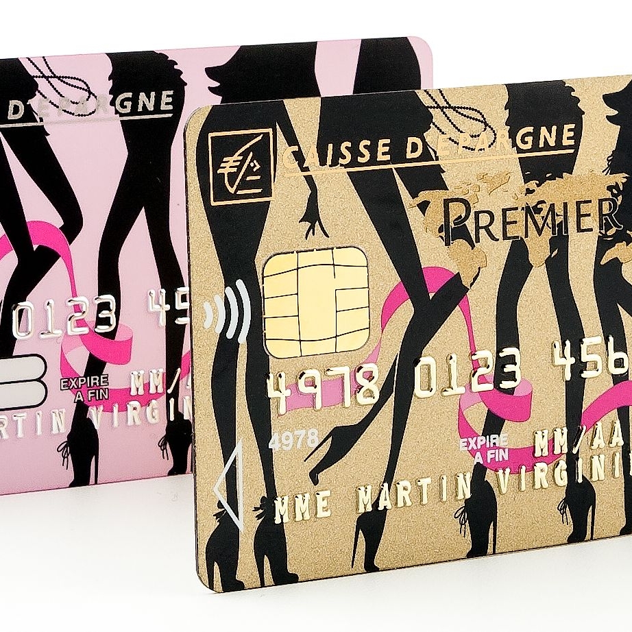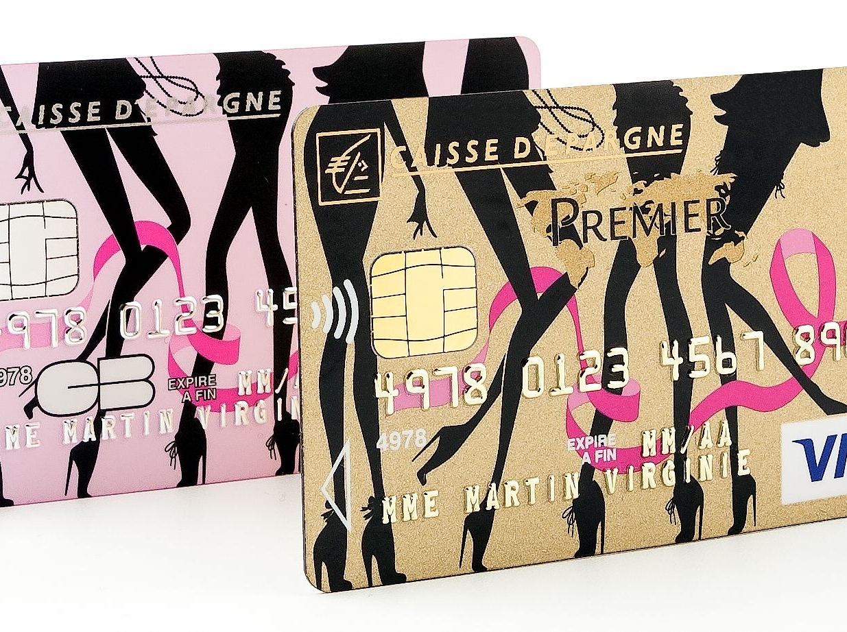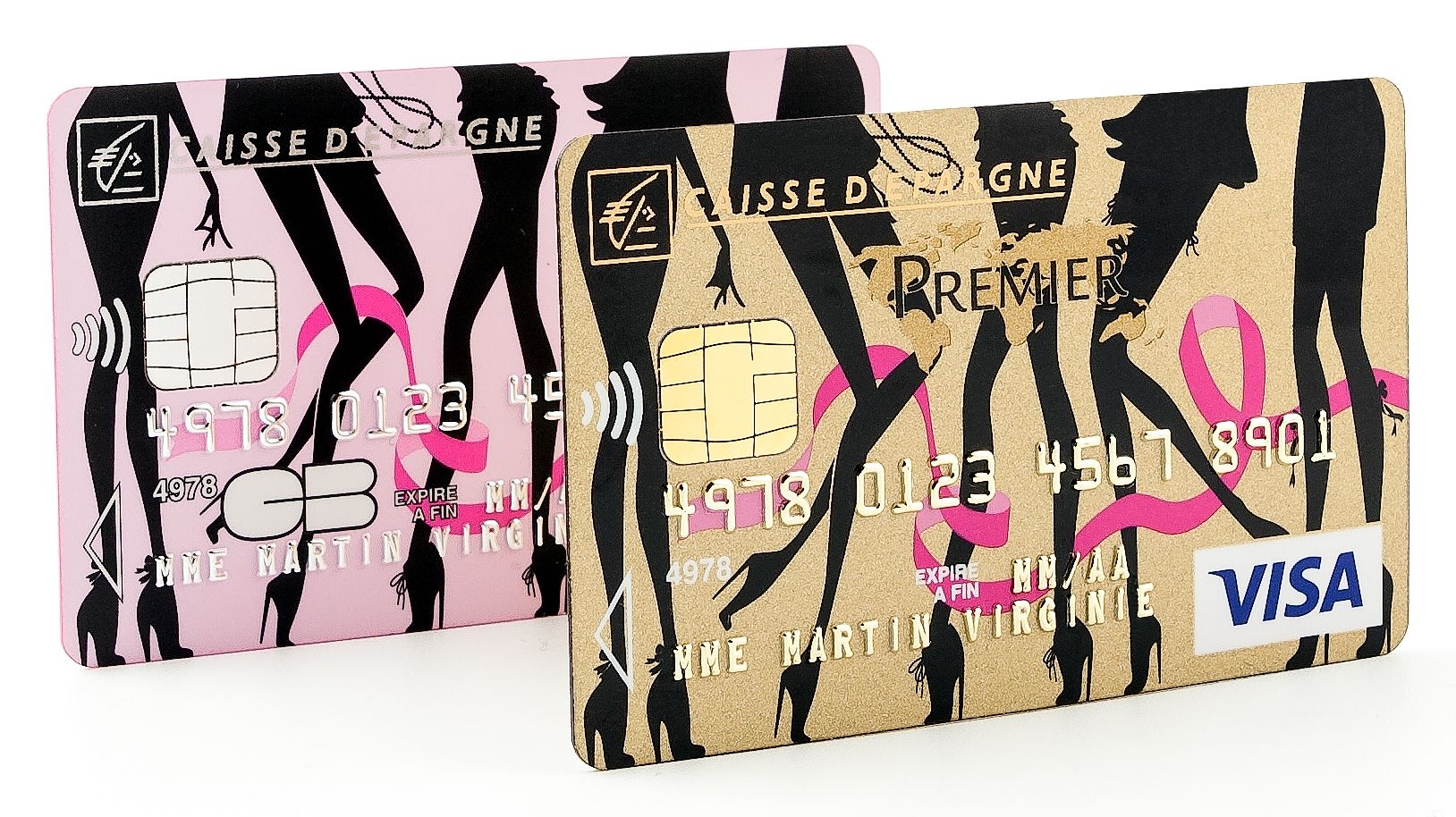 Cartes bancaires en édition limitée Caisse d'Epargne, design Chantal Thomass, soutenant la lutte contre le cancer du sein.