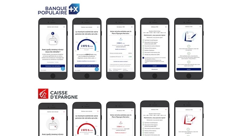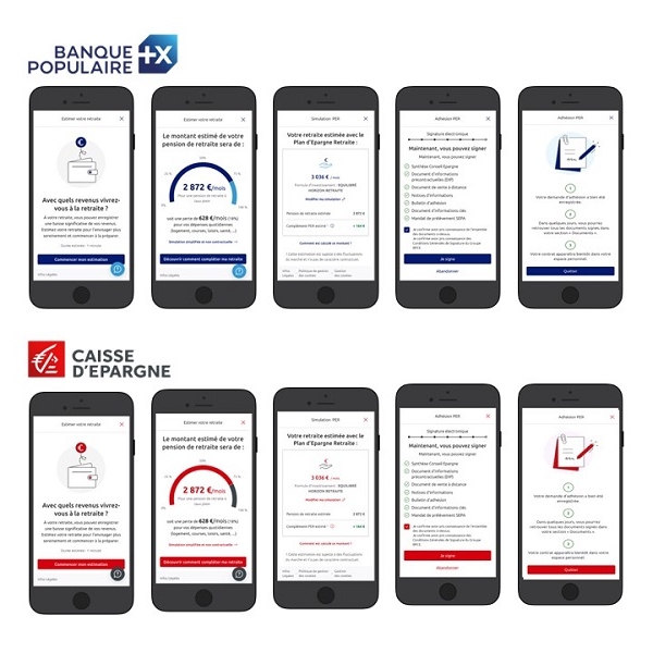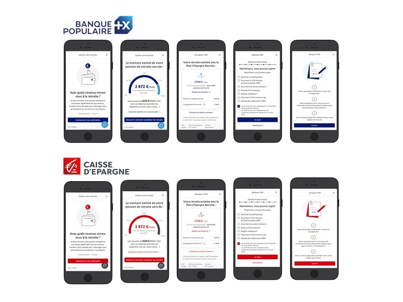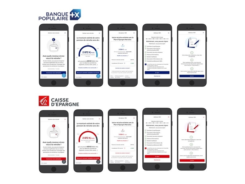 Capture d’écrans du parcours digital de souscription au Plan d’Épargne Retraite individuel des applications Banque Populaire et Caisse d’Épargne, illustrant la simulation et l’adhésion en ligne.