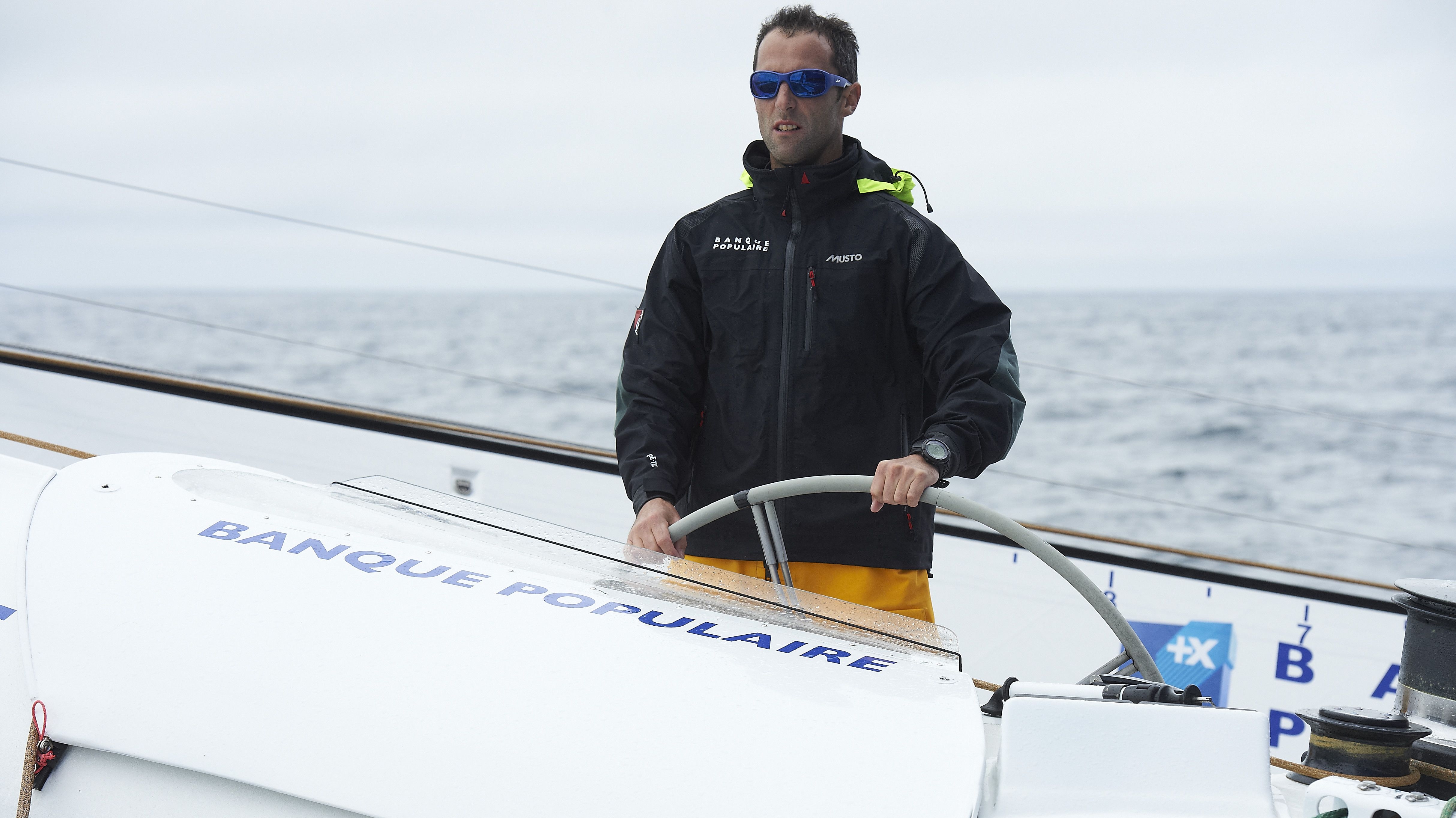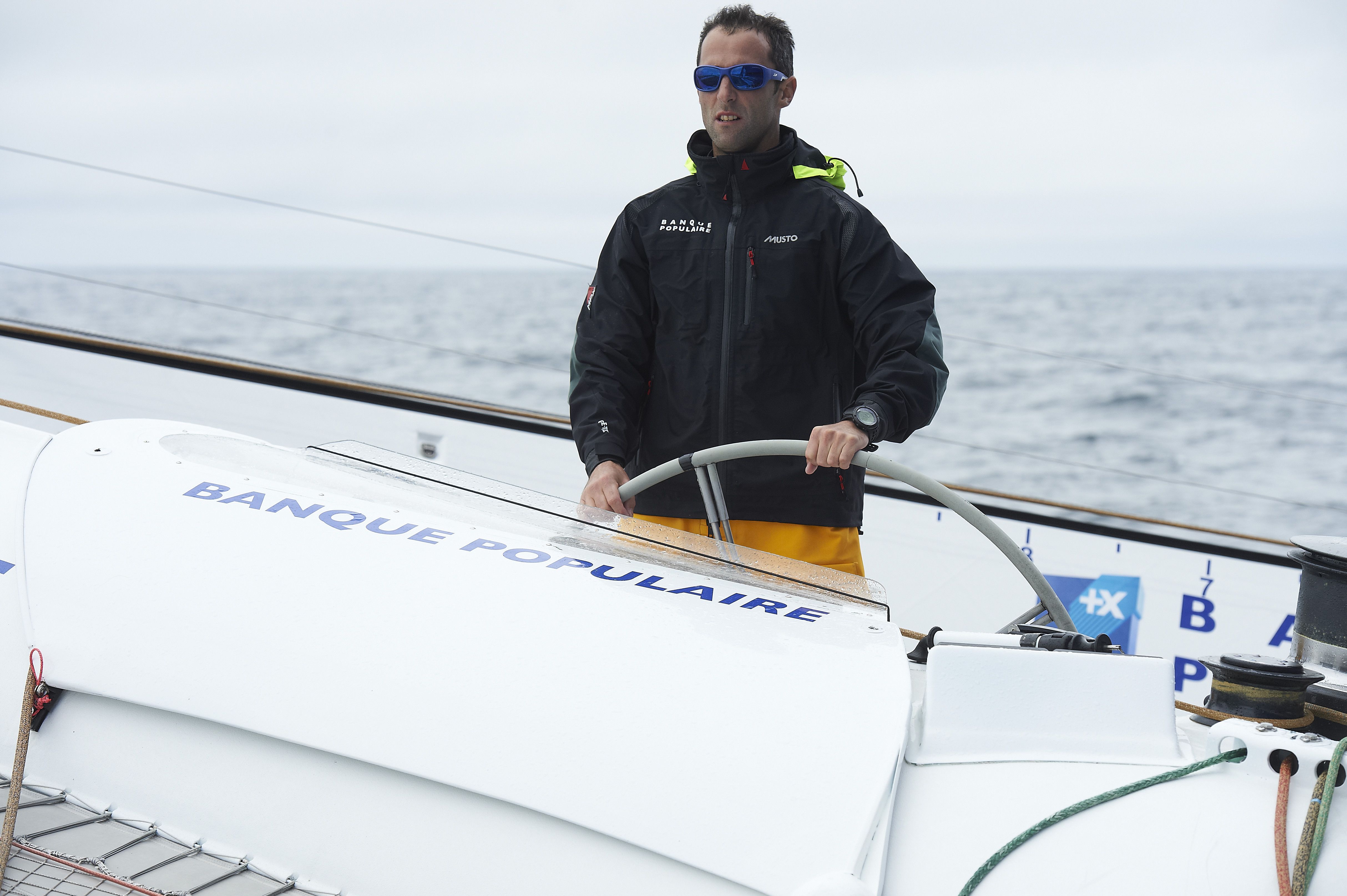 Portrait d'un skipper à la barre du voilier Banque Populaire en mer, durant une navigation en course au large.