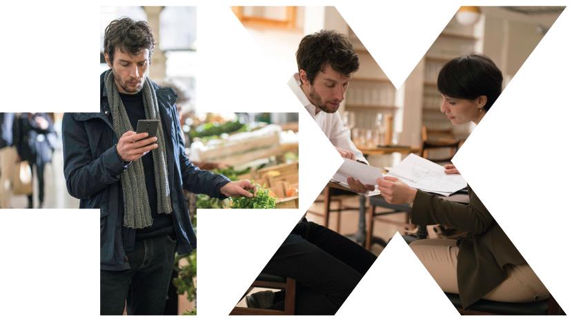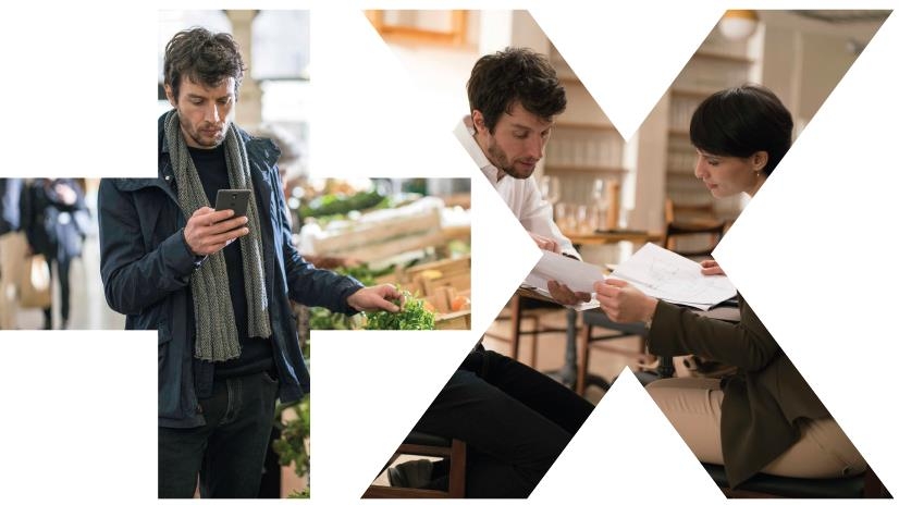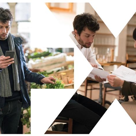 Un jeune entrepreneur consultant son téléphone dans un marché et discutant avec une conseillère sur des documents, illustrant un accompagnement professionnel.
