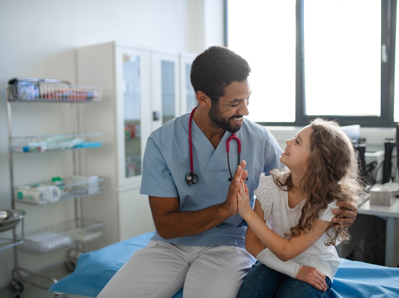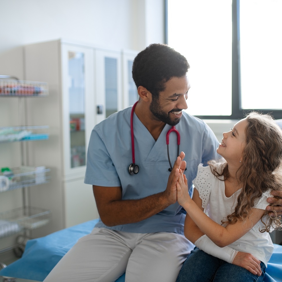 Un médecin en blouse examine une jeune patiente dans un cabinet médical lumineux, illustrant la relation professionnelle entre un soignant et un enfant.